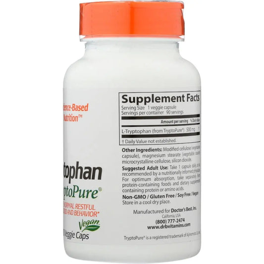 Doctor's Best L-Tryptophan 500 mg – 90 Veggie Caps | TryptoPure® | Mood & Sleep Support